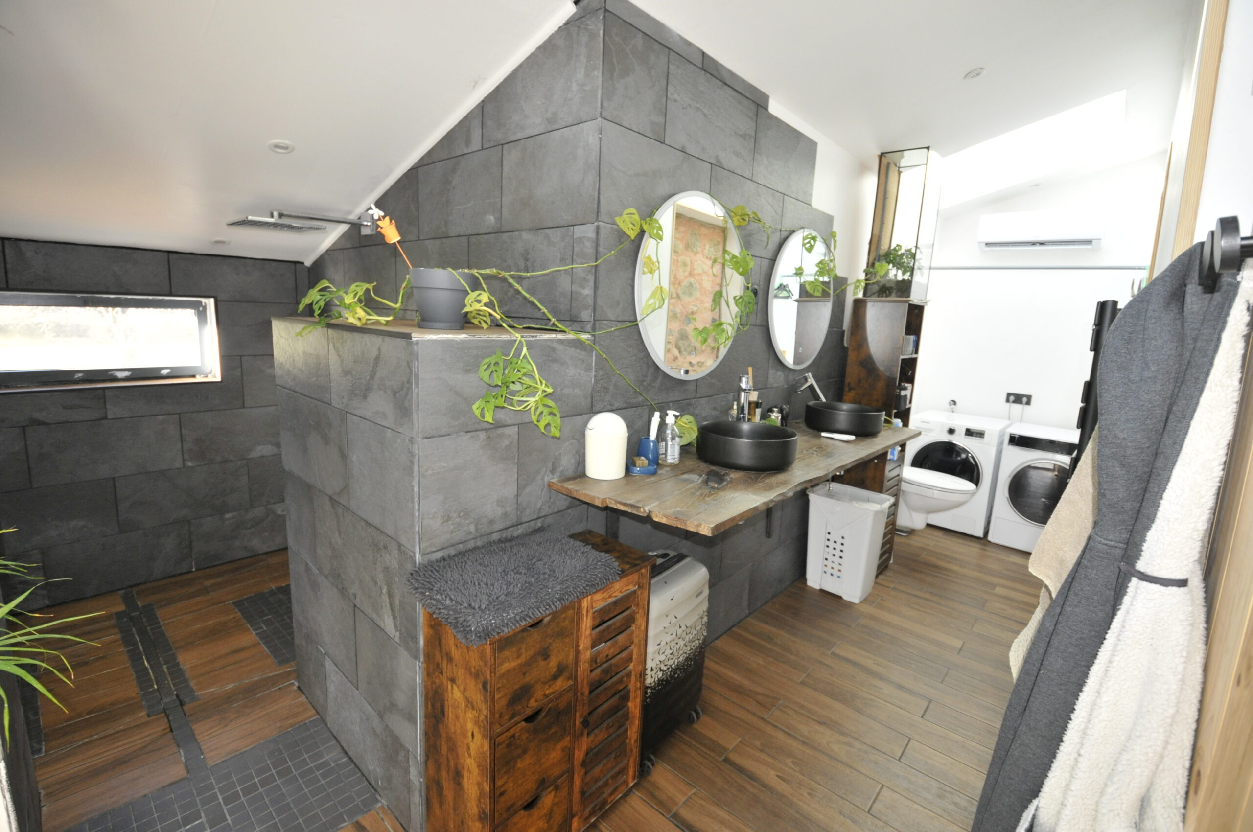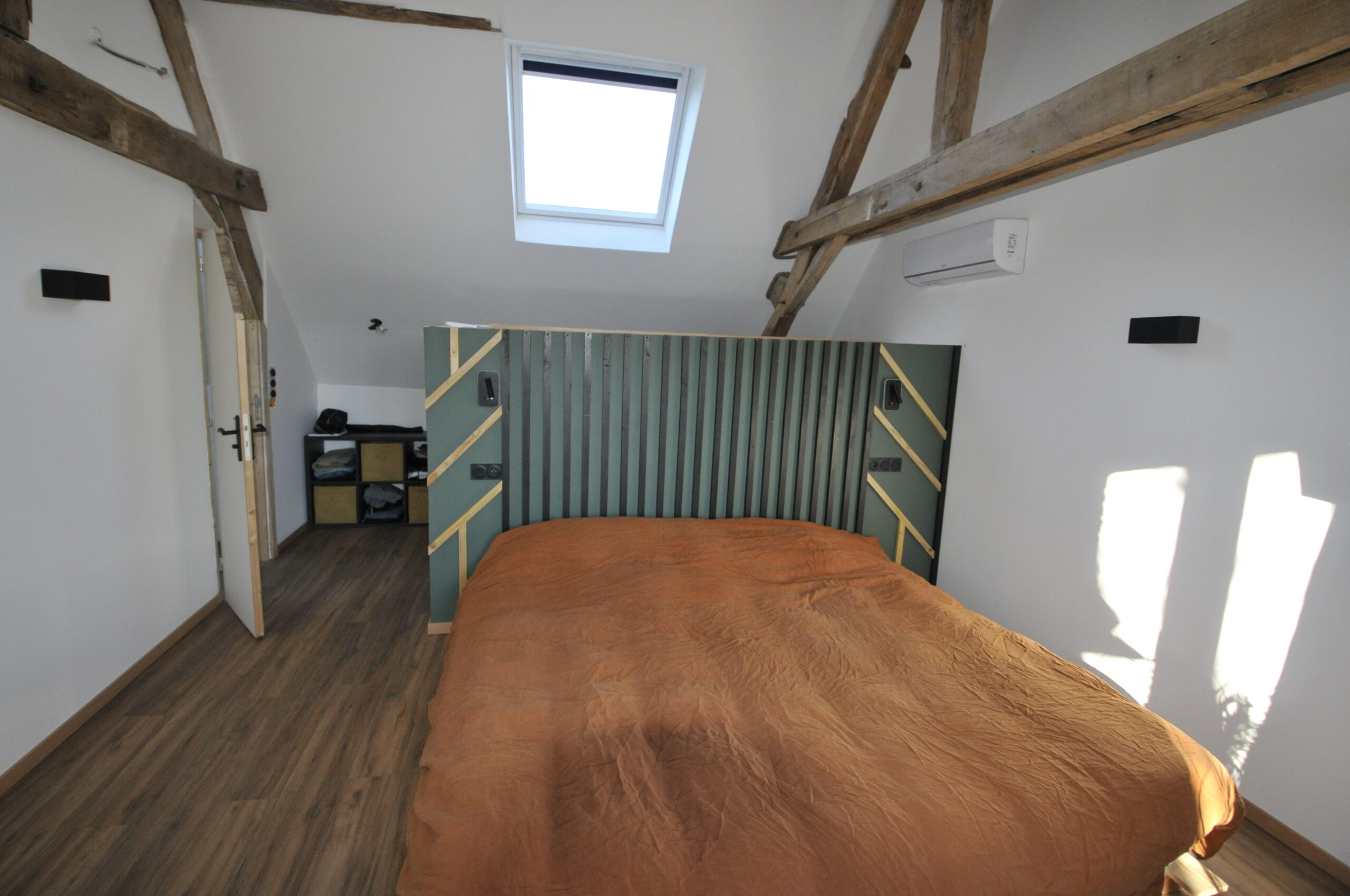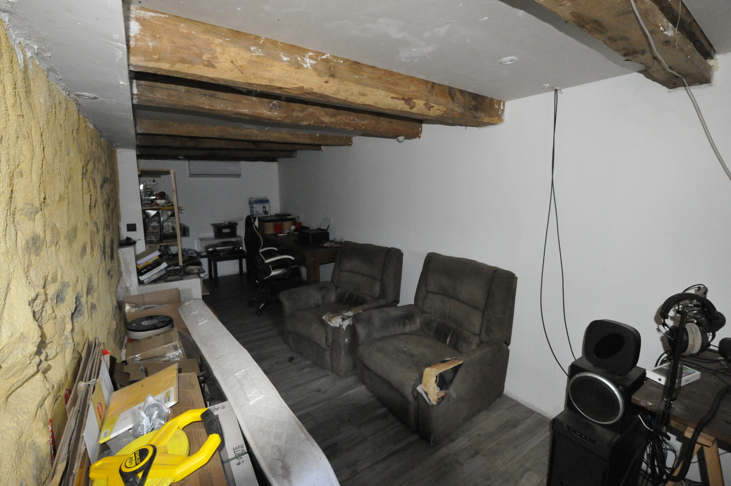 1°) Une maison d’habitation en pierre élevée sur cave composée: – d’un rez-de-chaussée avec un séjour (52,17m²) avec un insert au bois, une cuisine américaine équipée, un bureau (16,88m² agrandissement dans grange), une salle d’eau dans agrandissement avec wc (11,15m²); – d’un 1er étage avec une chambre 1 mansardé (21,16m² au dessus d’1,8m et 24,36m² au sol), une chambre 2 (14,23m²), un couloir. – d’une cave partiel dans le sous-sol (15,86m²) La dite maison est équipée du double vitrage avec menuiserie alu, d’un assainissement individuel, de pompes à chaleur air/air réversible.